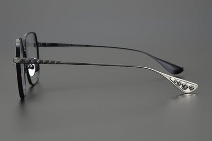 Make a statement with our Chrome Hearts-inspired polygon eyeglass frame, engineered from 100% pure titanium for maximum comfort and durability. The frame's oversized silhouette and angular geometry bring a bold edge to your everyday style, while the precision-engraved cross-star motifs on the temples channel a refined punk and gothic aesthetic.