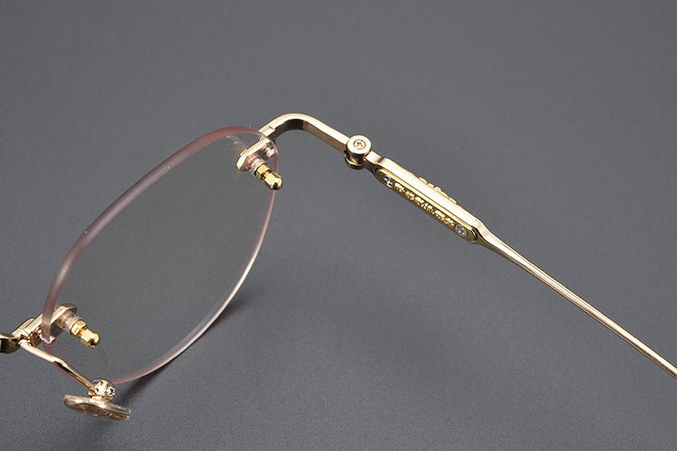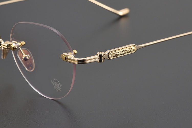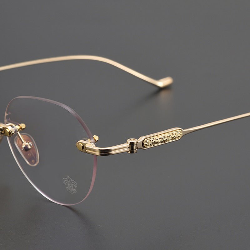 Inspired by punk minimalism and gothic artistry, this unisex frame features precision-engraved cross motifs that accentuate the temple arms with subtle elegance. The rimless design enhances your facial features naturally, making it ideal for everyday use, whether in the studio, on the street, or at the office.